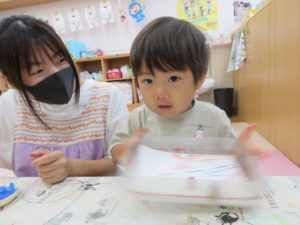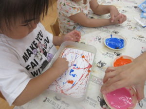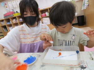 絵の具を使ってビー玉転がしを行いました。
