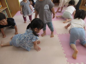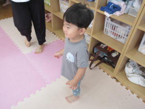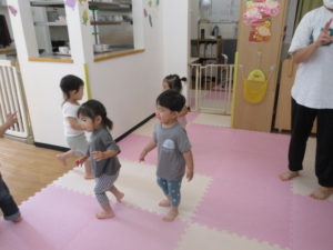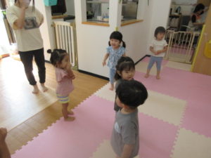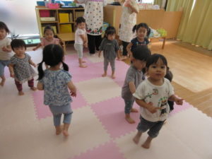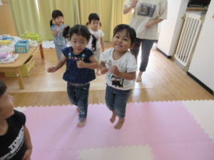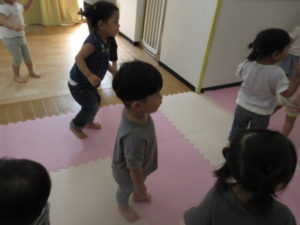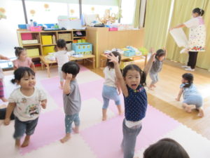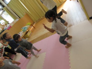 音楽に合わせて元気よく、跳んだりしゃがんだり、腕を大きく伸ばしたり、楽しみながら動くことが出来ました♪