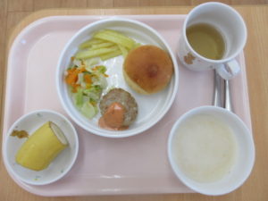 今日の給食は、【ロールパン、ハンバーグ、キャベツサラダ、ベイクドじゃが、コーンスープ、バナナ】でした。