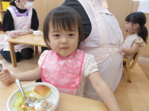 ハンバーグをはさむ子、サラダとハンバーグをはさむ子、何もはさまずパンだけで食べる子、それぞれの個性がみられ楽しいランチタイムになりました♪