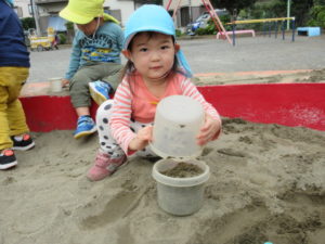 型を取ったり、カップやバケツに砂を入れてごっこ遊びを