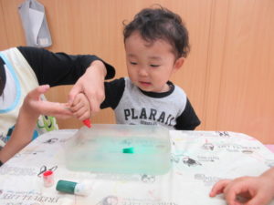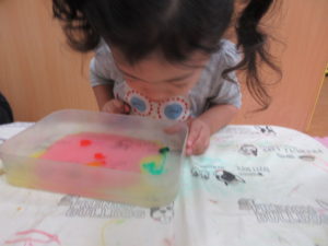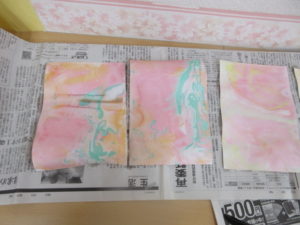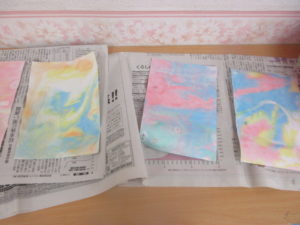 そら組さんは好きな色を水に垂らしてマーブル模様を作りました。みんな綺麗に出来ました。