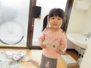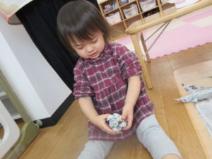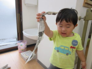 ひまわり組さんは新聞紙をちぎったり折ったり丸めたり、同じ新聞紙でもそれぞれ違う形になる様子が面白かったですね。