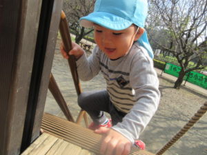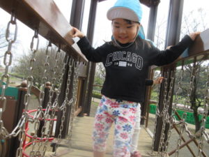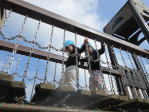 すべり台に乗ったり、揺れる木の橋で