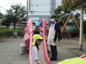 今日は朝のおやつを食べたあと、みんなで公園へお散歩に行きました。
