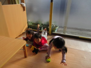 太陽が当たり、暖かい場所で寝ころんで遊ぶ子どもたちが