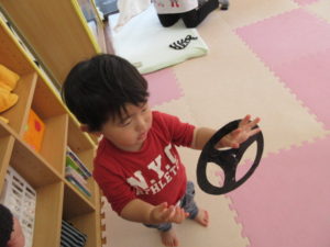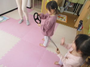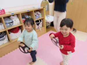 ハンドルをもらって歌に合わせて走ります。