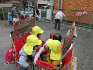 今日は 近隣の住宅からの火災の想定で駐車場に避難しました。