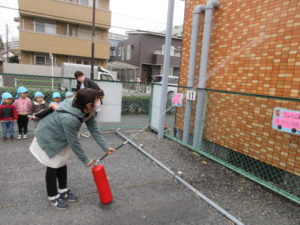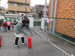 そして保育者は 消火器を使って初期消火の実践をします。