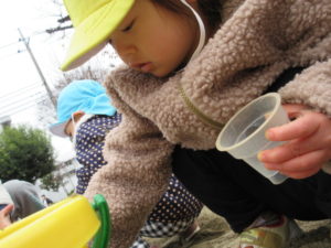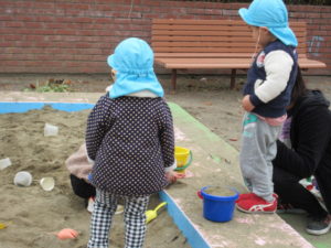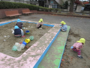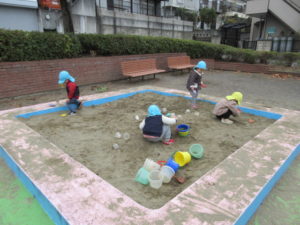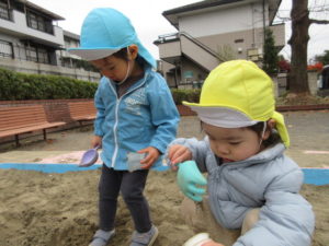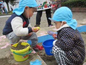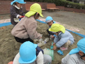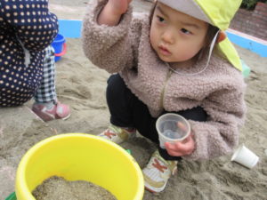 砂場遊びのチームは カップやバケツでケーキやご飯を作ってくれました。