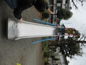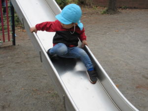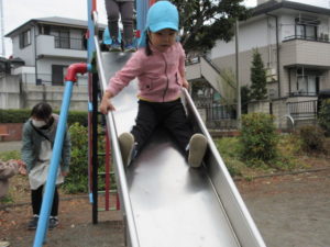 すべり台チームは 高さのあるすべり台をちゃんと順番に並んで滑ります。