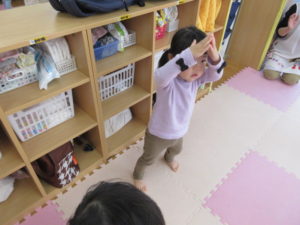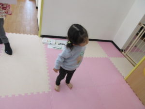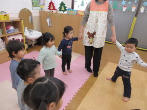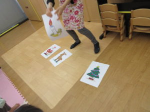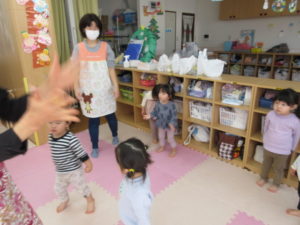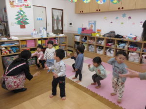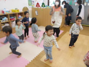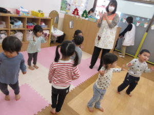 クリスマスのダンスを教えてもらって一生懸命真似っこして踊っています。