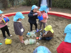 楽しそうなお兄さんお姉さんの真似をして0歳児のお友だちも上手にカップにケーキを作っていました🍰(糸)