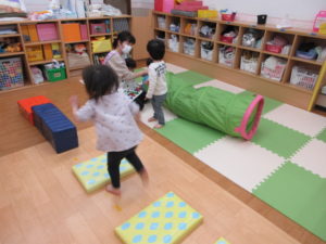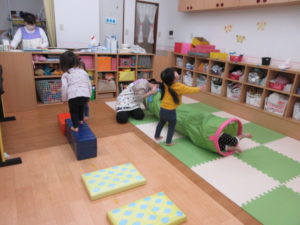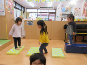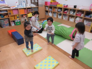 最初は 少し高さが怖くても二、三回保育者と一緒にやってみればもう大丈夫(^^♪
