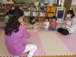 英語があり、そら組さんは天気の様子を先生の真似をして言ってみたり、イラストを触ったりして
