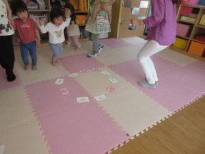 ひまわり組さんは先生の合図でボールを転がしたり、音楽にのせて体を動かしていました。