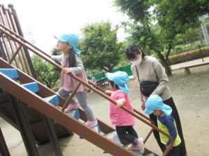 はじめは保育者と一緒に、そして次第に慣れてくると1人で渡れるようになったお友達もいました🎶
