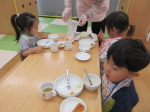 パンに野菜やお肉を挟んで「サンドイッチ~🥪」と嬉しそうに話すお友達もいましたよ。