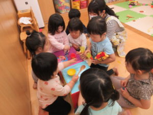 机を出すと、たちまち子どもたちが集まって来てパーティーが始まりました♪「かんぱいしよう♪」と声をかけ合ったりと楽しそうな子どもたちです😊