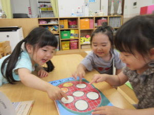 リトミックでも楽しんでいるわらべ歌。子どもたちは大好きで、おせんべいを指さしながらみんなで歌って楽しんでいます。