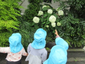 お散歩の道中であじさいの花を見つけると「あじさいだ~♪」と嬉しそうに話すそら組さん。