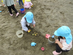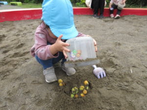 また、バケツにたくさんの砂と梅の実を詰めてケーキを作るお友達もいました!
