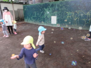 2つ繋がったシャボン玉を見て「雪だるま~」