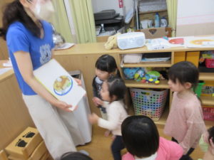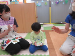 今日の天気をみんなで答えたり、色々な色のカードの場所にみんなで歩いていき、美味しそうな食べ物をみんなで食べたり…♪