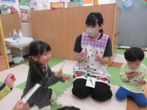 最後にはバースデイゲームを楽しみました。丸く円になるようにカードを並べて、音楽に合わせてその周りを歩きます。音楽が止まって、自分の前にあるカードをめくってみてバースデイカードだったお友達をみんなでお祝いする楽しいゲームです♪