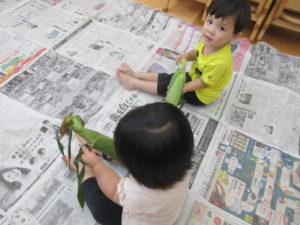 今日は食育で“トウモロコシの皮むき”をそら組さんが行いました♪
