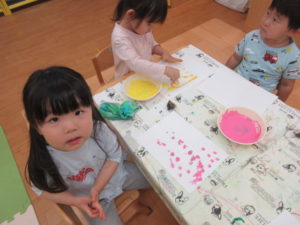 そら組さんは園のプランターで採れたお野菜の端っこを使ってスタンプをしました。