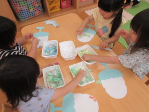 先週みんなで綺麗に染めた半紙を細かくちぎってかき氷のシロップに変身させていきます✨