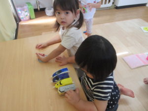 新幹線の玩具をかき氷に見立てて、綺麗に並べながらお店屋さんを開いていました。