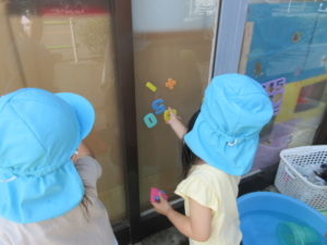 水につけると壁にペタンとくっつく数字の玩具で遊びました!