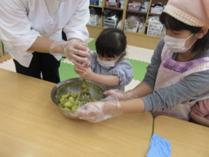 今日はそら組さんで、食育「スイートポテト作り」を行いました。