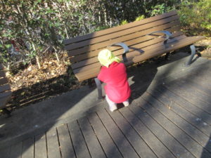 かくれんぼでは鬼役がベンチの前で数を数えます。