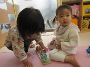 お部屋ではお友達と一緒に型はめパズルで遊びました。
