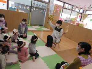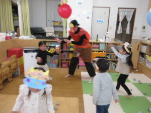 「おにはーそと!」と大きな声で言いながらそら組さんのお姉さんが鬼さんと戦ってくれました!