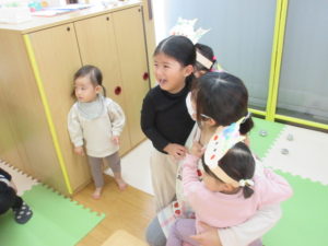 みんなが一生懸命作った鬼のお面をつけてそら組さんのお部屋に集合です♬
