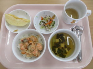 今日の給食は、【鮭とえのきのみそバター焼き丼、キャベツのゆかり和え、すまし汁(小松菜、豆腐)、りんご】でした。