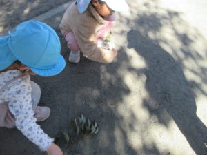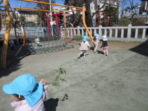 枝を角に見立てて「鬼だぞ~」とみんなから逃げて遊びました♪