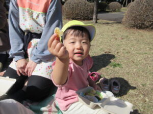 調理の先生がお弁当を持ってきてくれたことに気付くと、外で一緒に過ごせることが新鮮なようで嬉しそうな子ども達でした🌟