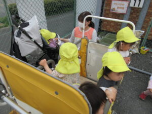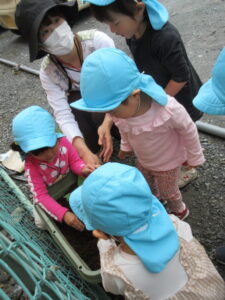 その後は、ひまわり組は園周辺散歩、そら組はピーマンの苗を植えました。