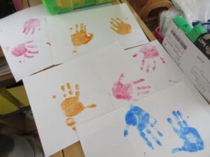 ひまわり組は手形スタンプで、そら組は絵具で手形をとりました✋