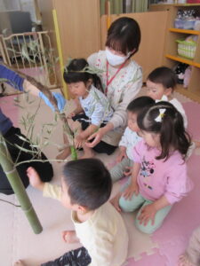 今日は食育でタケノコに触れました。皮付きのままなこともあり、見た目から怖がる子どもも・・・・。