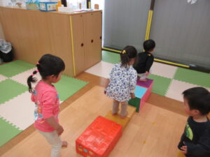 色々な高さの台を一列に並べて、落ちないようにバランスを取りながら進んで最後は元気よくジャンプします🌟
