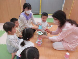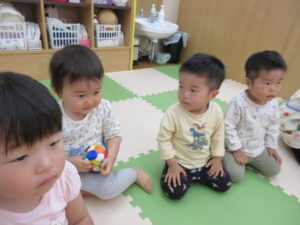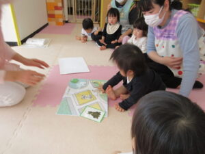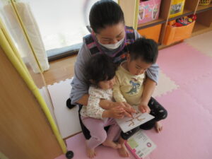 みんな絵本を読んでもらうのが大好きで、先生の膝の上は満席です♪