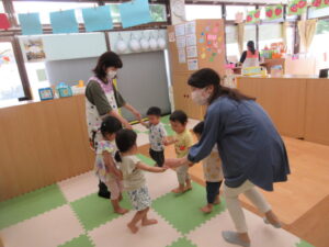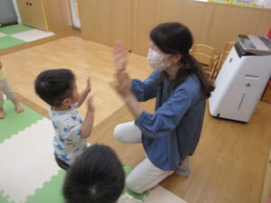音楽が止まるタイミングで先生達の輪の中に入れたお友達は、先生とハイタッチ🌟