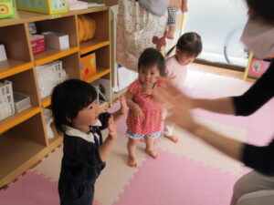 ひまわり組の子どもたちはGood Morningソングで体を元気よく動かし、先生とハイタッチ!