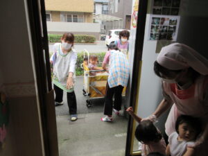 突然の出来事にびっくりする子もいましたが、泣くこともなく保育士の誘導に従い、